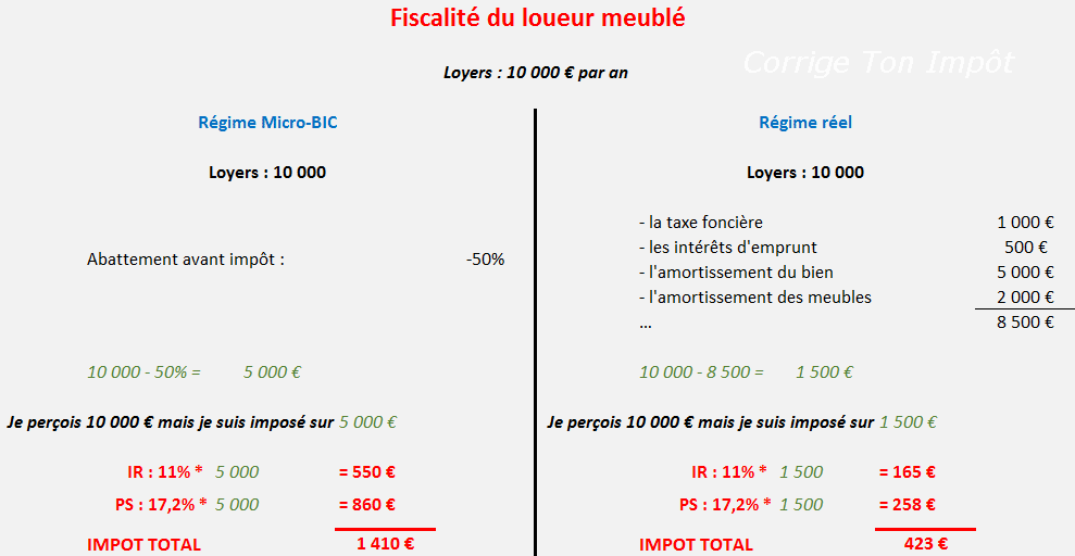 Monsieur Corrigetonimpôt a déclaré 10 000 € de loyers, abattement de 50 % appliqué, base imposable : 5 000 €. Supposons une tranche à 11 %. Il paie 5 000 € x 17,2 % = 860 € de prélèvements sociaux et 5 000 € x 11 % = 550 € d’impôt sur le revenu. Total : 1 410 € de fiscalité.