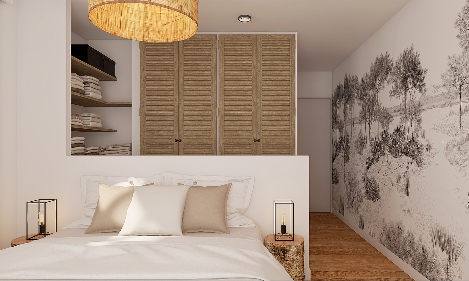 Dans l’un de ses projets, Johanna, architecte d’intérieur chez Rhinov, a imaginé une suite parentale où chaque zone trouve naturellement sa place. Ambiance douce, touche ethnique, tout respire la détente.