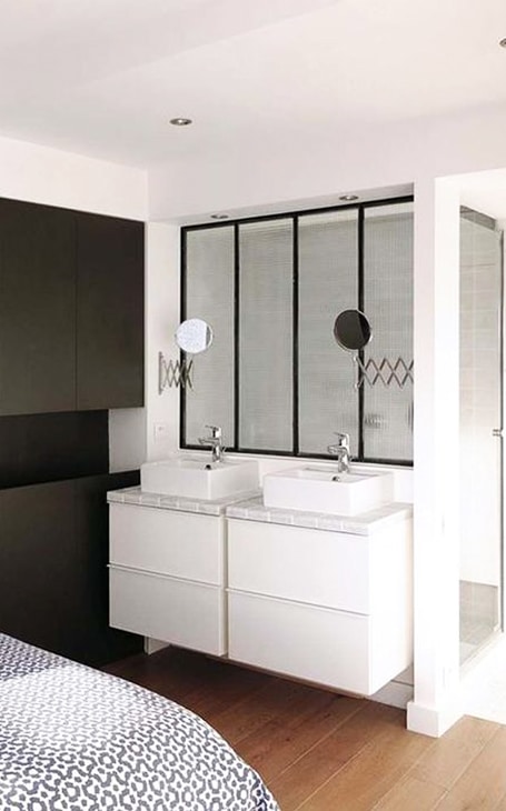 Pour l’agencement d’une salle de bain dans une suite parentale, le double vasque reste le choix le plus pratique pour une utilisation à deux. À défaut, un grand lavabo de plus d’un mètre, équipé de deux robinets, fonctionne aussi très bien.